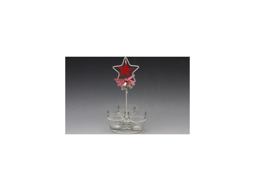 Kovový svícen s třemi skly na svíčku, barva bílá. Rozměr: Svícen: výška 28 cm, sklo: výška 6,5 cm, průměr 6,5 cm.